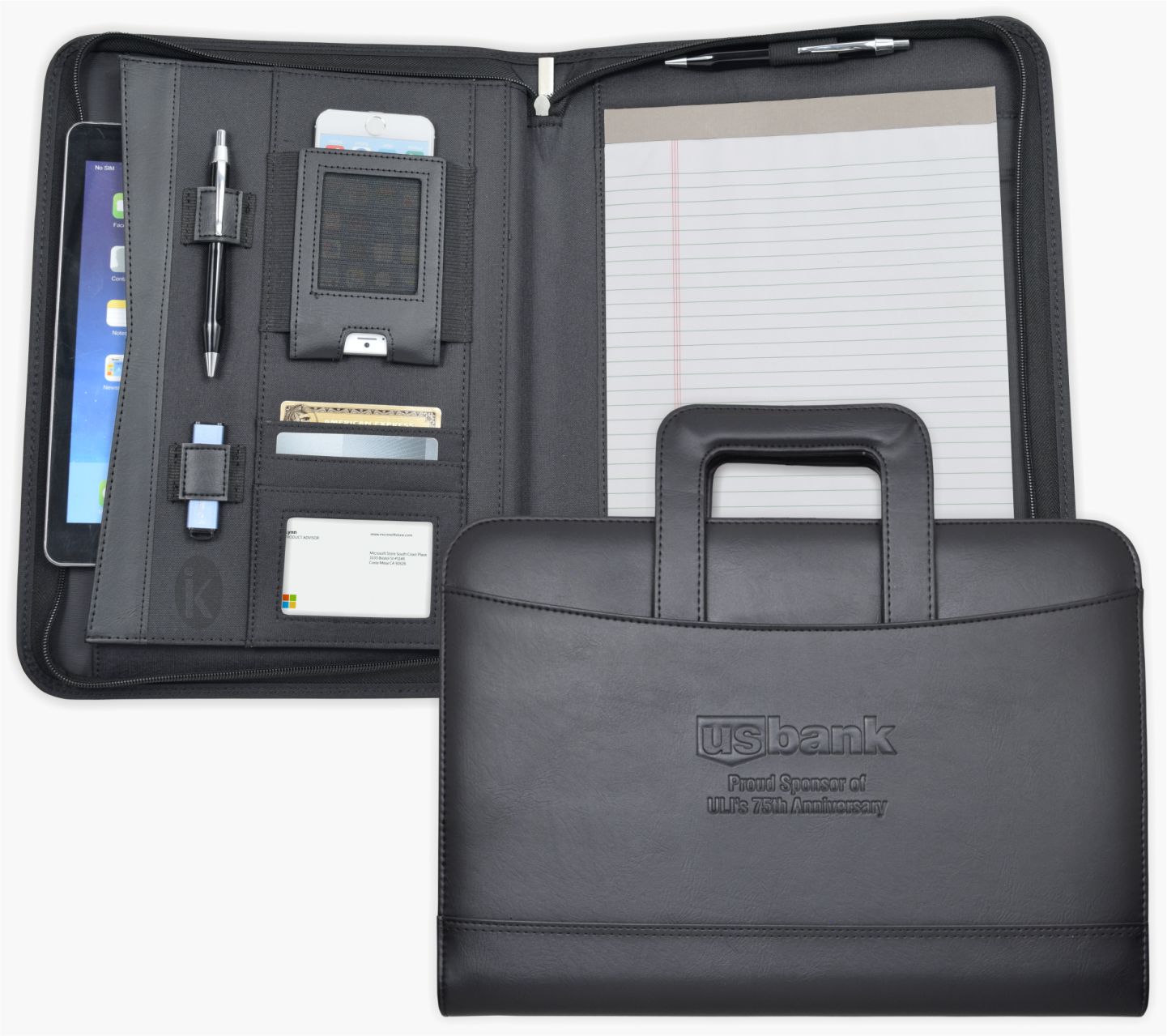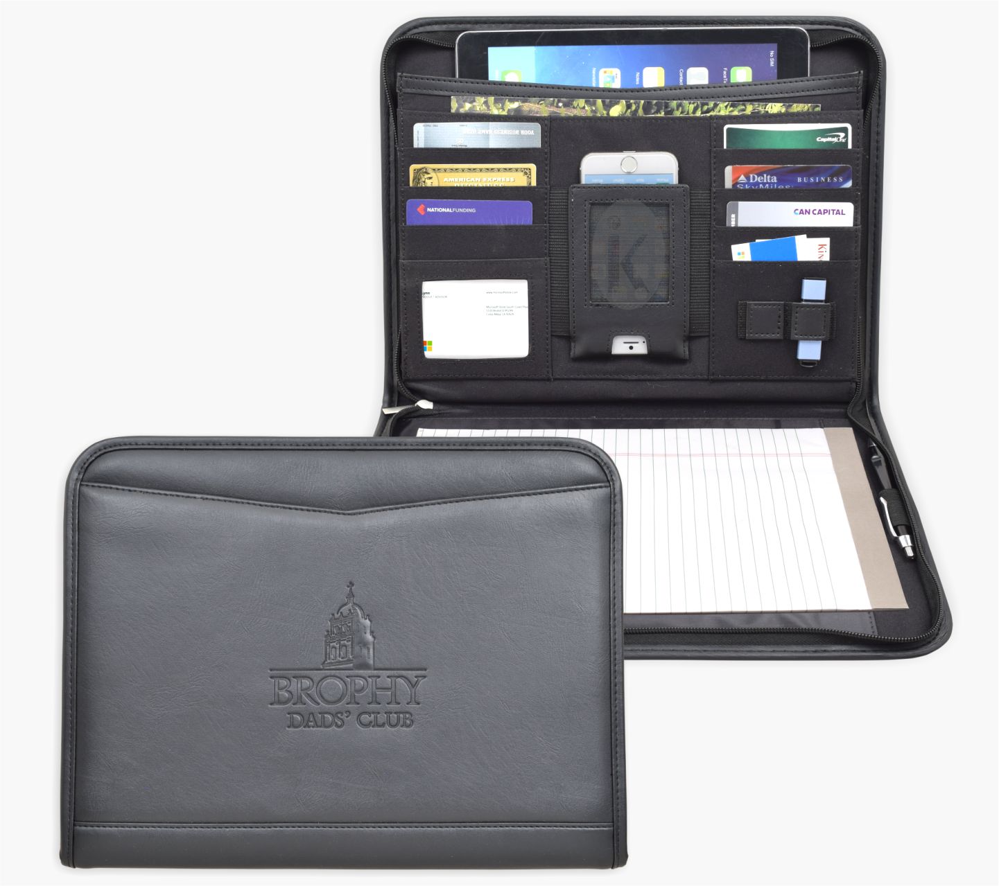 Zippered, Letter size business case/padfolio, iPhone pocket, internal file pocket to fit iPad or tablet, external file pocket, USB disk holders, multiple card holders & pen loop. 8½" x 11" letter size writing pad included. Black soft simulated leather/Vinyl. Price includes a deboss imprint to finish the quality & classic look of this product.