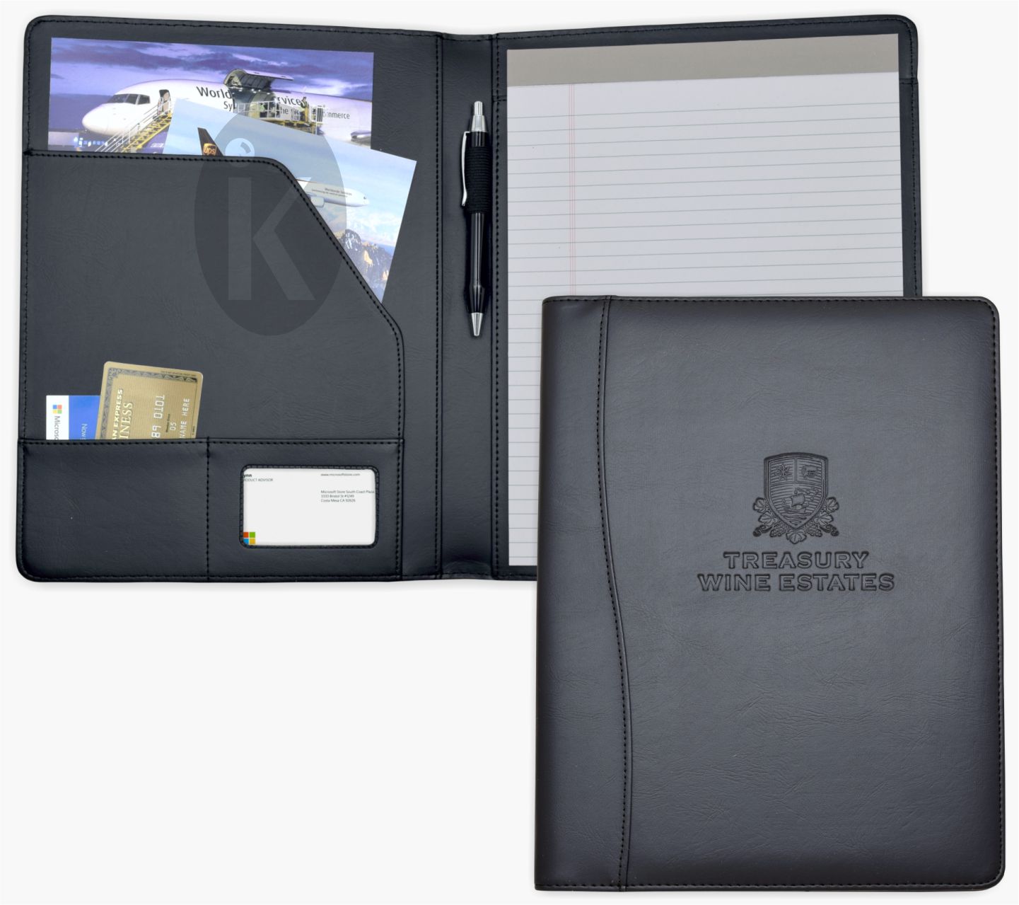 Letter size writing pad folder/padfolio, 8 ½” x 11” writing pad included, internal file pocket,USB disk holders, multiple card holders & pen loop. Black soft simulated leather/Vinyl. Price includes a deboss imprint to finish the quality & classic look of this product.