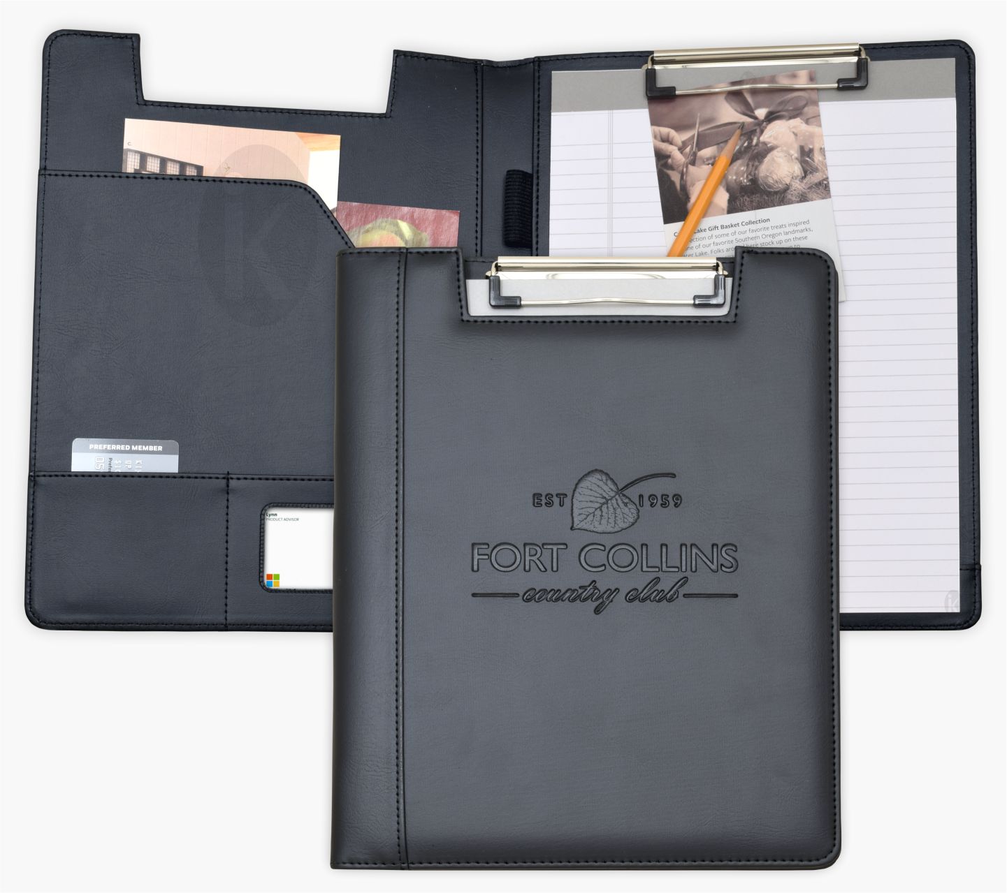 Letter size writing pad folder/padfolio, with Clipboard, 8 ½" x 11” writing pad included, internal file pocket, multiple card holders & pen loop. Black soft simulated leather/Vinyl. Price includes a deboss imprint to finish the quality & classic look of this product.